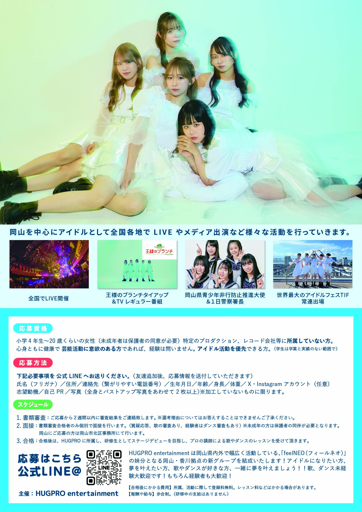 合格後は、「HUGPRO entertainment」に所属し、ステージデビューを目指し歌やダンスのレッスンを受けて頂きます。